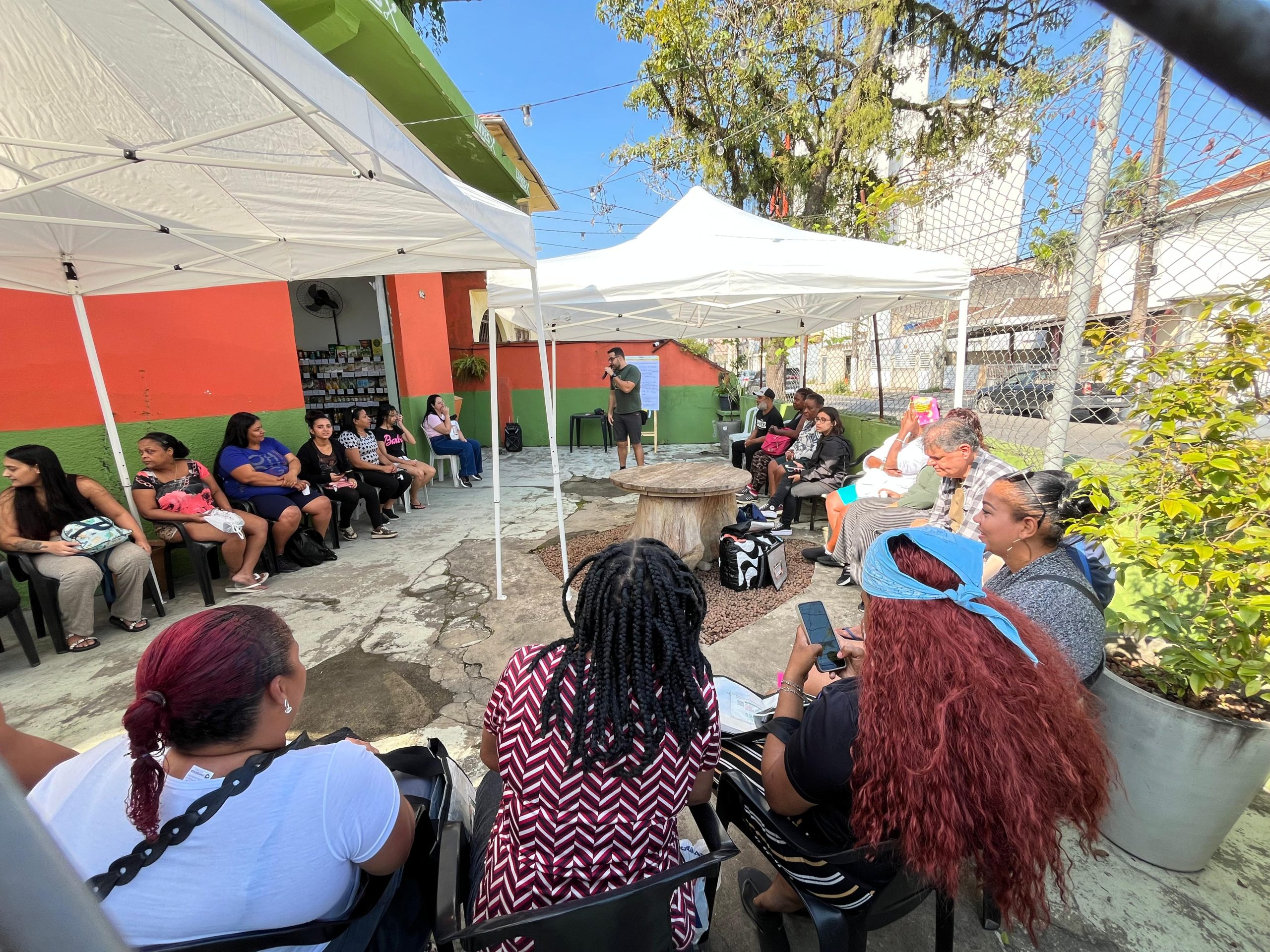 Executado na cidade de Santos por meio de um termo de fomento com a Secretaria Municipal da Mulher, Cidadania, Diversidade e Direitos Humanos (SEMULHER), o projeto concentrou suas atividades formativas entre julho e outubro de 2025. A edição atendeu 30 famílias em situação de vulnerabilidade e contou com 11 oficinas sobre Economia Solidária, Soberania Alimentar, Cooperativismo e Agroecologia, acompanhadas da distribuição contínua de 450 cestas de alimentos agroecológicos da agricultura familiar. Como experiência prática de autogestão, as participantes organizaram a 9ª Feira de Economia Solidária e Agroecologia. A avaliação final demonstrou um impacto nutricional expressivo: 96,4% das famílias relataram mudanças positivas, o consumo semanal de salada crua saltou de 3 para 5,4 dias, o de frutas de 2,8 para 4,9 dias, e a ingestão de ultraprocessados caiu de 3 para 2,5 dias. Além disso, 78,6% passaram a consumir novos alimentos (hortaliças, grãos e tubérculos) e o ganho de autonomia alimentar levou 53,6% a cozinhar mais em casa e 39,3% a testar novas receitas.